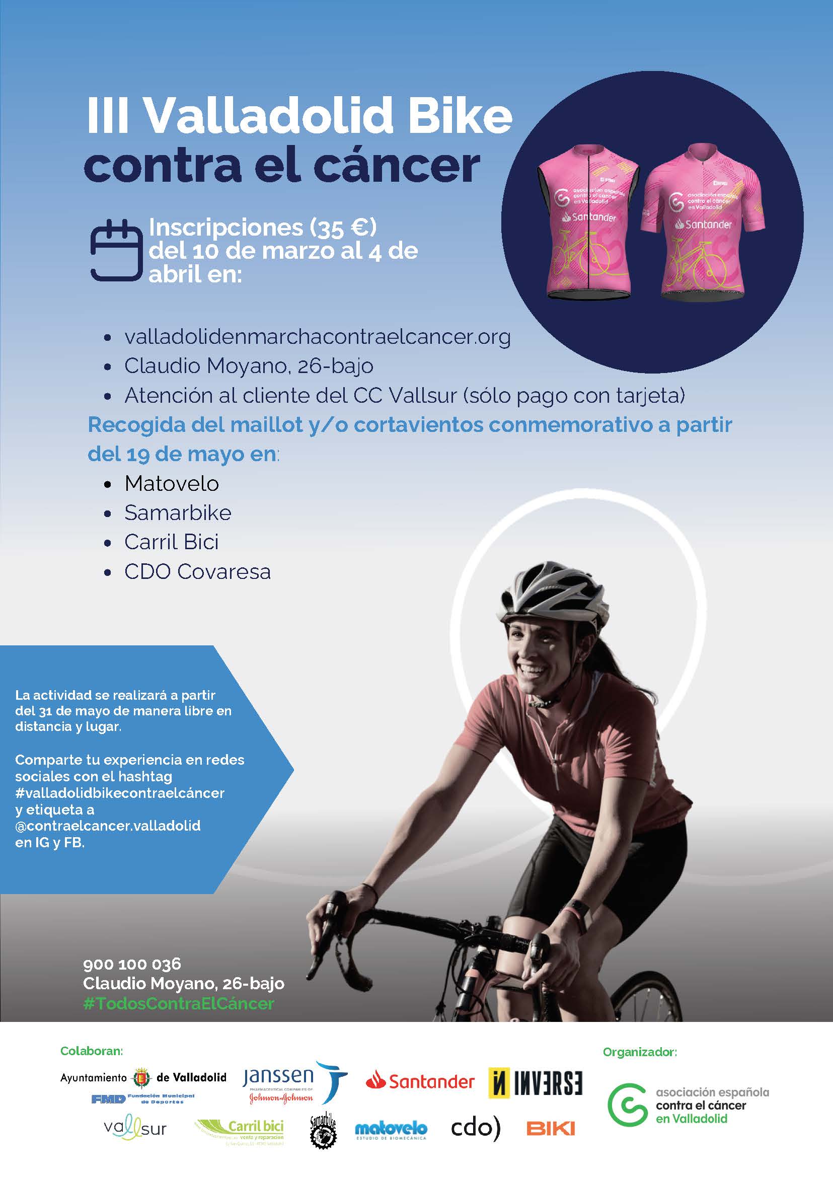 Inscríbete y reserva tu maillot o cortavientos, o ambas prendas, hasta el 4 de abril en esta web, en la sede de la Asociación Española contra el cáncer de Valladolid en Claudio Moyano, 26; o en atención al cliente de Vallsur.